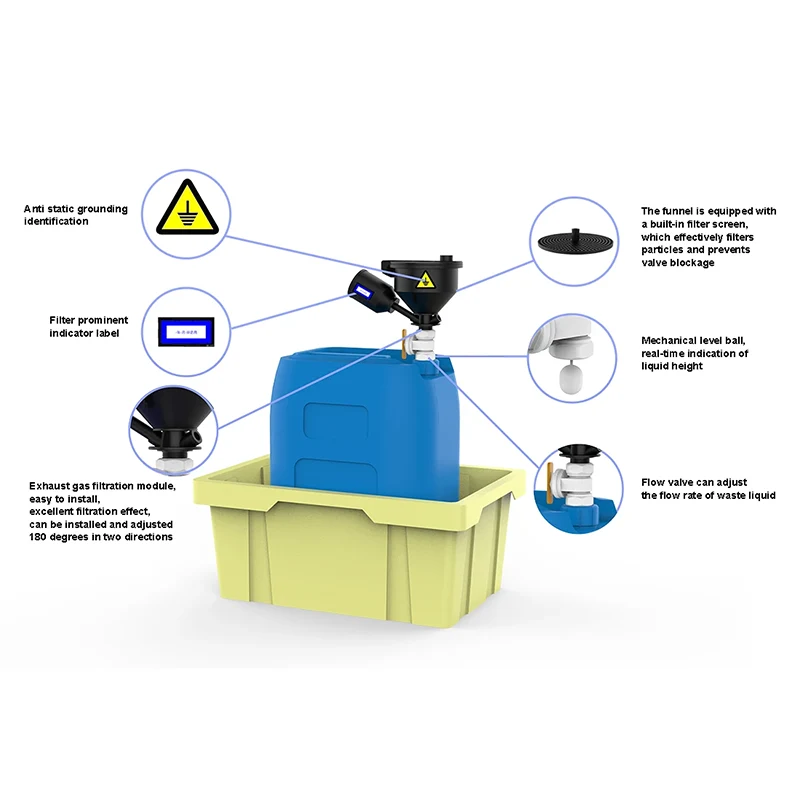कचरा द्रव संकलन यंत्रामध्ये उल्लेखनीय वैशिष्ट्ये आहेत. त्याचे संकलन कंटेनर आयातित अँटी-स्टॅटिक PP कच्च्या मालापासून बनलेले आहे, जे केवळ सामग्रीची स्थिरता सुनिश्चित करत नाही तर अँटिस्टॅटिक एजंटचे कार्य प्रभावीपणे करते, 10^5 ते 10^9 च्या श्रेणीतील कचरा द्रव फनेलची स्थिर वीज नियंत्रित करते, sta विजेमुळे उद्भवणाऱ्या आपत्तींचा धोका मोठ्या प्रमाणात कमी करते. फनेलमध्ये अत्याधुनिक डिझाइन आहे. लीक-प्रूफ टॉप कव्हर सीलिंग कव्हर आणि स्प्लॅश-प्रूफ फिल्टर फनेलसह जोडलेले आहे आणि कचरा द्रव संचयनाची सुरक्षितता सुनिश्चित करण्यासाठी आवश्यकतेनुसार वाल्व स्थापित केले जाऊ शकते. काउंटरवेट प्रकारचे टॉप कव्हर 100Pa वर उघडण्याच्या आणि 50Pa वर बंद होण्याच्या अंतर्गत दाबाच्या परिस्थितीनुसार एक्झॉस्ट गॅस उत्सर्जन स्वयंचलितपणे समायोजित करते, विस्फोट आणि उत्स्फूर्त ज्वलन टाळते. एक्झॉस्ट गॅस फिल्टर सर्पिल पद्धतीने जोडलेले आहे, जे बदलण्यासाठी सोयीचे आहे आणि रासायनिक घटकांचे अस्थिरीकरण प्रतिबंधित करते. विविध एक्झॉस्ट गॅस उपचारांमध्ये अचूक रुपांतर करण्यासाठी 5 विविध प्रकार उपलब्ध आहेत.